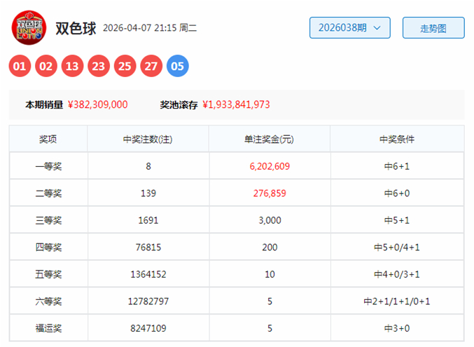 双色球第2026038期开出奖号:红球01、02、13、23、25、27,蓝球05。当期红球三区比为2:1:3,奇偶比为5:1,和值为91,跨度为26,蓝球在第二区出现。